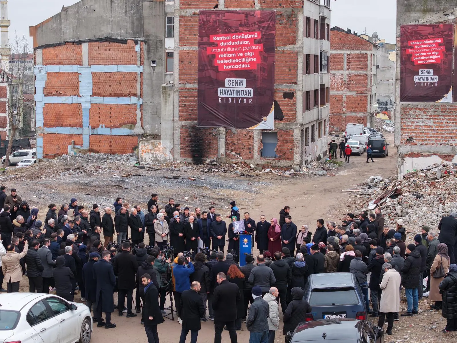 Bizler AK Partili teşkilat mensupları olarak belediyelerimiz olarak kentsel dönüşüm seferberliğimizi hız kesmeden devam ettireceğiz. Ve özellikle burada bulunan mağdur olan vatandaşlarımızın hakkını hukukunu sonuna kadar korumaya devam edeceğiz. Bakın burada 400’ün üzerinde bina söz konusuydu. 200’ün üzerindeki binayı anca yıkabildiler. 200’ün üzerinde yine bina var olduğu yerde duruyor. Şunu da görüyoruz burada arkamızda içerisi boşaltılmış; tamamen elektriği, suyu, doğalgazı kesilmiş yıkılmayı bekleyen ama beceriksiz İBB yönetimi tarafından yıkımı dahi becerilemeyen bir durumda. Bu metruk binalarda her türlü suç ve her türlü kötü fiil işlenmeye devam etmekte” ifadelerini kullandı.