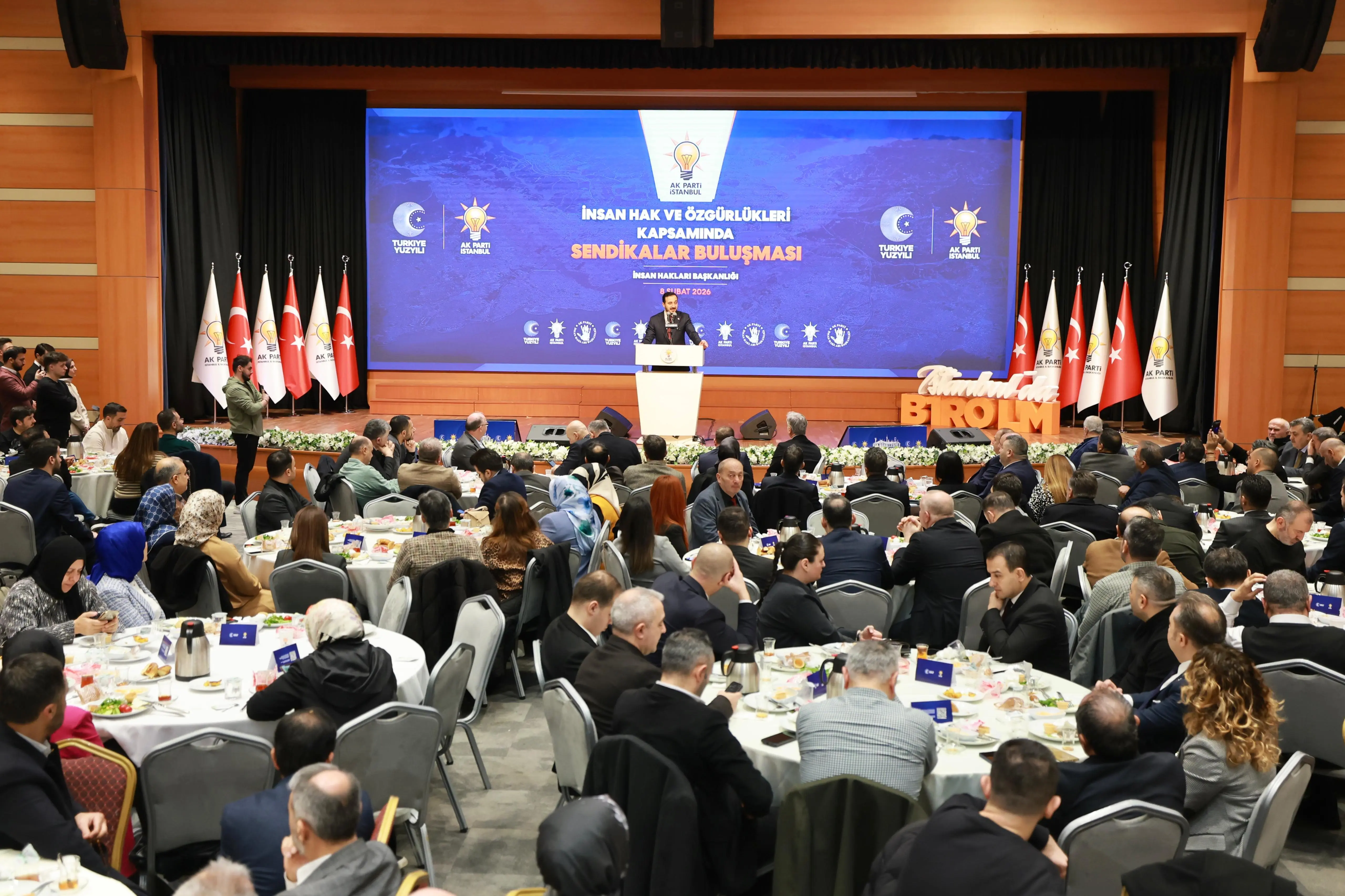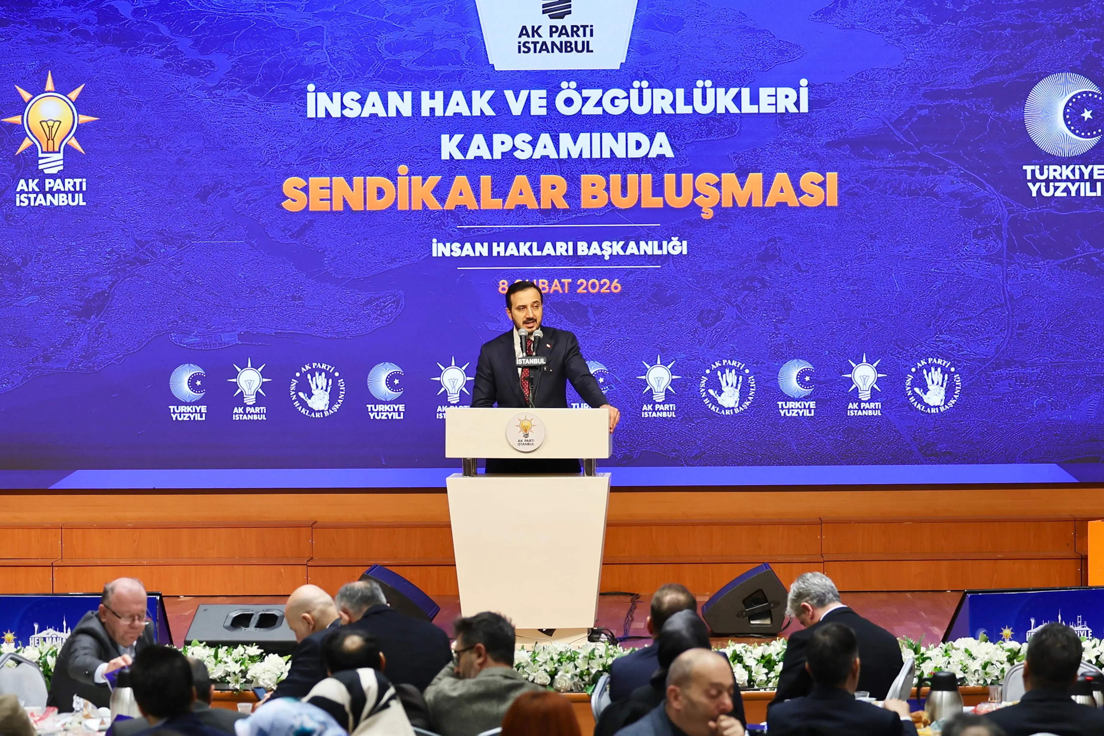 “Bugün burada, İstanbul’umuzda emeğin sesi olan sendikalarımızın değerli temsilcileri ile aynı masa etrafında buluşmaktan büyük bir mutluluk duyuyoruz. Bu buluşmayı sadece bir istişare toplantısı olarak değil; emeğe, alın terine, sosyal adalete ve çalışma barışına verilen ortak bir değerin güçlü bir ifadesi olarak görüyoruz. AK Parti olarak insan haklarını yalnızca bireysel özgürlükler çerçevesinde değil, çalışma hayatında adaletin, hakkaniyetin ve onurun korunması olarak ele alıyoruz. AK Parti iktidarı döneminde sendikal hakların güçlenmesi adına çok önemli reformları hayata geçirdik. Sendikal örgütlenmenin önündeki engeller kaldırılmış, noter şartı tarihe karışmış, darbe döneminin ürünü olan sendikal mevzuatlar demokratik standartlara kavuşturulmuştur. 1 Mayıs istismarın değil emeğin ve dayanışmanın günü hâline getirilmiştir. Taşeron işçilerin kadroya alınmasıyla çalışma hayatında tarihi bir adım atılmıştır. Sosyal güvenlikte yapılan reformlarla emekçilerimiz insana yakışır hizmetlere kavuşmuştur. Bugünkü buluşmamız da işte bu anlayışın bir devamıdır. Farklı görüşlerimiz, farklı tecrübelerimiz olabilir. Ortak paydamız nettir: Türkiye’nin huzuru, çalışma barışı ve emeğin itibarıdır.”