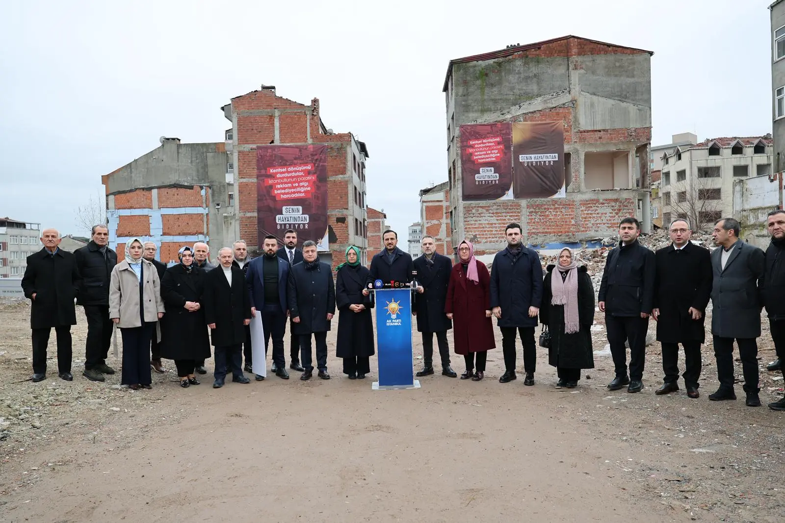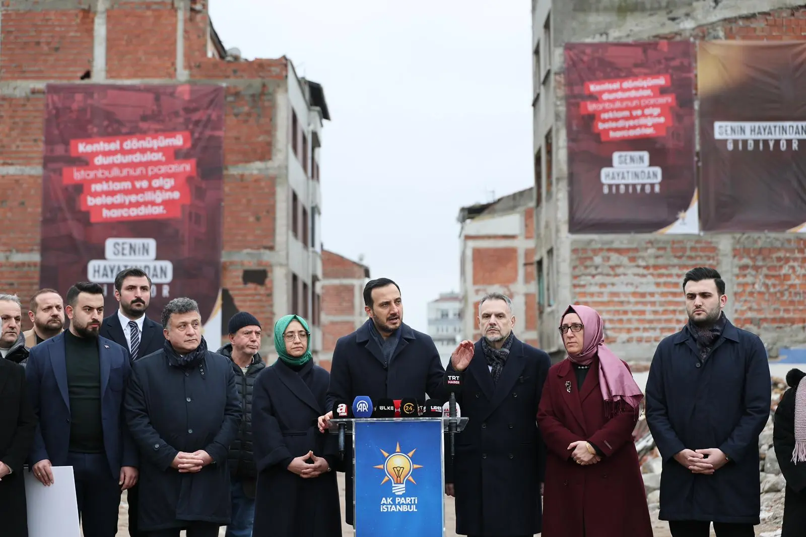 Bizler AK Partili teşkilat mensupları olarak belediyelerimiz olarak kentsel dönüşüm seferberliğimizi hız kesmeden devam ettireceğiz. Ve özellikle burada bulunan mağdur olan vatandaşlarımızın hakkını hukukunu sonuna kadar korumaya devam edeceğiz. Bakın burada 400’ün üzerinde bina söz konusuydu. 200’ün üzerindeki binayı anca yıkabildiler. 200’ün üzerinde yine bina var olduğu yerde duruyor. Şunu da görüyoruz burada arkamızda içerisi boşaltılmış; tamamen elektriği, suyu, doğalgazı kesilmiş yıkılmayı bekleyen ama beceriksiz İBB yönetimi tarafından yıkımı dahi becerilemeyen bir durumda. Bu metruk binalarda her türlü suç ve her türlü kötü fiil işlenmeye devam etmekte” ifadelerini kullandı.
