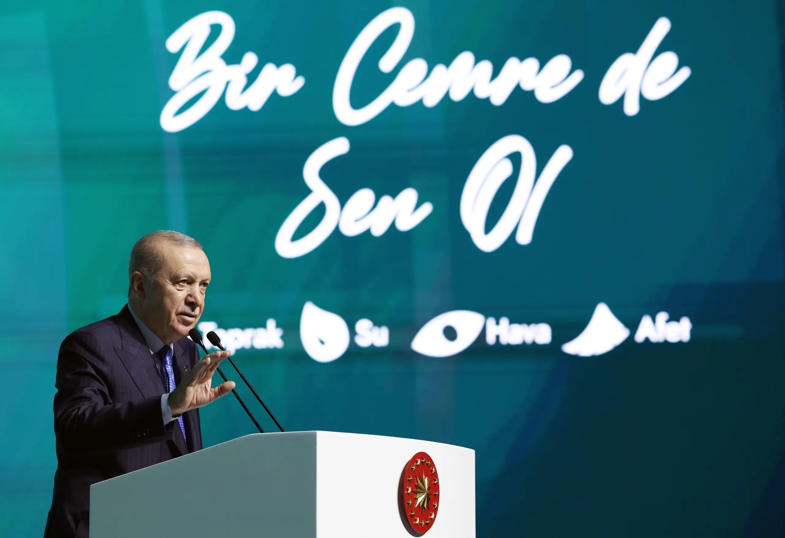 Cumhurbaşkanımız Erdoğan, "Bugün tüm dünya, çevre ve iklim meselesinde ciddi sınamaların eşiğinde bulunuyor. Sanayi atıkları, spreyler, dumanlar, petrol ve ilaç atıkları, plastik ürünler, suni gübreler, çöpler, kimyasal atıklar çevremizi çok hızlı biçimde kirletiyor" diye konuştu.