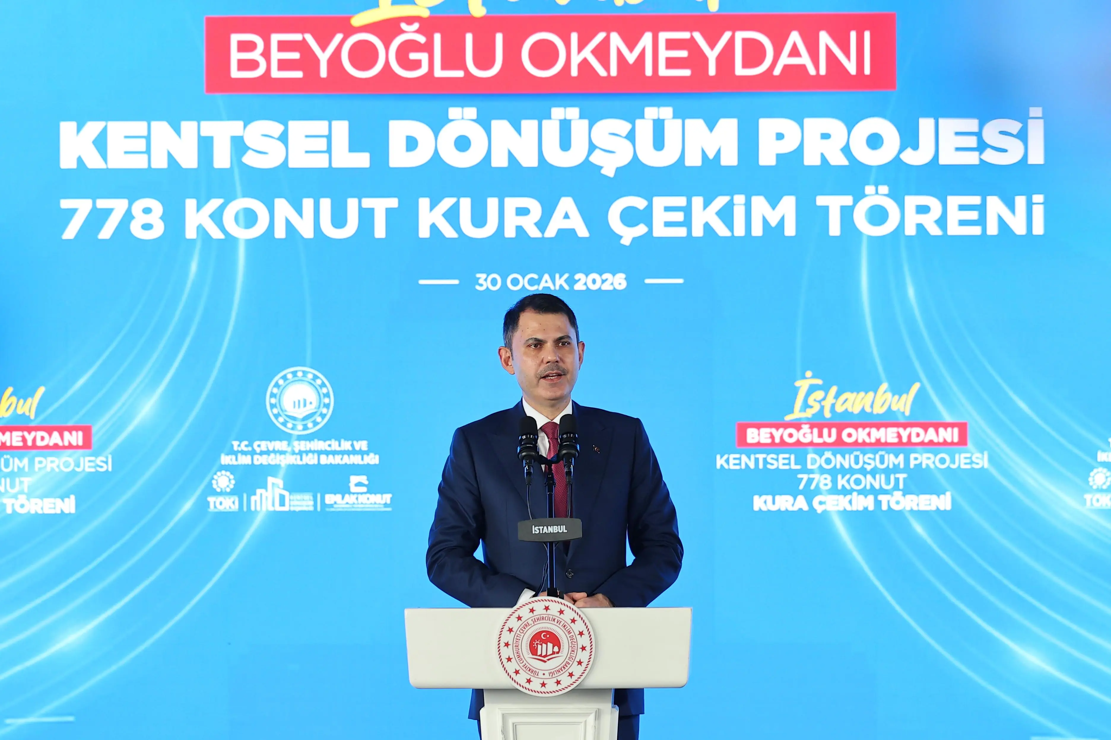Çevre, Şehircilik ve İklim Değişikliği Bakanımız Murat Kurum, “Bugün Okmeydanı'ndaki kardeşlerimizi 939 ev ve işyerine kavuşturuyor, bizi, Okmeydanı'nın annelerine, yavrularına mahcup etmeyen Allah'a hamd ediyor; yeni yuvalarımız hayırlı uğurlu olsun diyorum. Bugün ABD'de, Almanya'da bir afet olduğunda vatandaşını sigorta şirketinin insafına terk eden bir anlayış varken; Türkiye artık, afet öncesi ve sonrası hızlı, kaliteli konut üretiminde de, kentsel dönüşüm tecrübesinde de tüm dünyada bir numaradır. Biz bu gücümüzü, kabiliyetimizi ve 11 ilimizde kazandığımız büyük tecrübeyi şimdi başta İstanbul olmak üzere 81 ilimize taşımak istiyoruz. Bunun için Cumhurbaşkanımızın açıkladığı Yüzyılın Konut Projesi ile 500 bin sosyal konutu milletimize kazandırmak için hızla çalışıyoruz. Şu ana kadar 35 ilimizde kuraları çektik; 127 bin hak sahibimizi belirledik. Allah'ın izniyle önümüzdeki günlerde İstanbul'un kuraları için yine bir araya gelecek, 100 bin sosyal konutun hak sahiplerini; coşkuyla belirleyeceğiz. İstanbul'umuzda tabii kiralık konutlarımız da olacak, onun da sürecini ayrıca ilerleteceğiz. Bu iki büyük tecrübenin hızla yansıtılması gereken bir yer var. O da aslında Türkiye'nin bağımsızlığının anahtarı olarak gördüğümüz İstanbul'umuzdur. İstanbul'umuz; her an deprem tehdidi ile yaşayan milyonlarca kardeşimize ev sahipliği yapmaktadır. İstanbul'un depreme hazırlanması, bu ülke için bir beka meselesidir, varlık-yokluk meselesi olarak gördüğümüzü her zaman ifade ediyoruz. Bu anlayışla hareket ediyor, şu anda her iki kentsel dönüşümden birini İstanbul'da gerçekleştiriyoruz. Bugün İstanbul'un neresine giderseniz gidin, orada bizi görürsünüz.” ifadelerini kullandı.